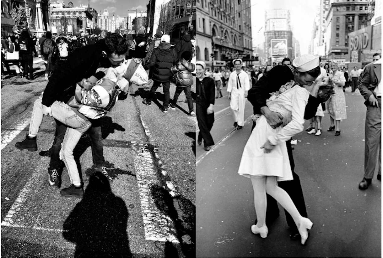 On the right: the iconic photo of George Mendonsa kissing Greta Zimmer. They didn’t know each other. But World War II had just ended. It was time to CELEBRATE.